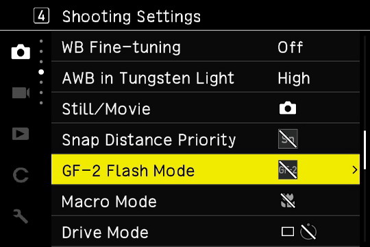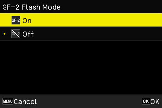 韌體更新至 1.60 或更高版本後,相機選單中將新增「GF-2 閃光模式」。