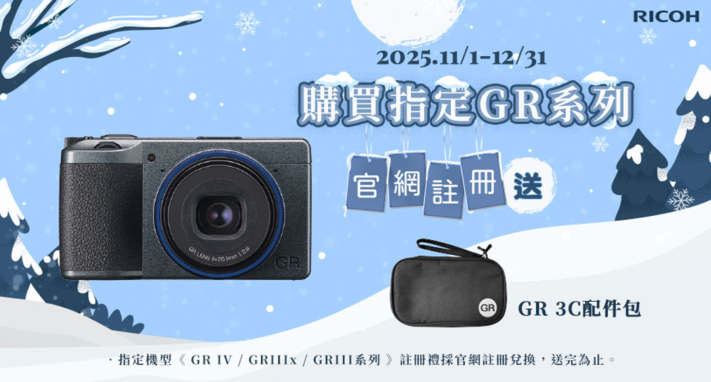 GR3x 海神藍 城市標準版註冊禮!GR 3C配件包 ●採用特殊防滑高質感金屬灰機身塗裝 ●搭配海神藍限定鏡頭環 ●新增「3.5m」快拍距離設定 GR系列相機因數量有限,每人限購壹台。 訂單經審視後,同一訂購姓名或地址或電話,於2個月內購買GR系列相機二次以上, 本公司得取消訂單並退還支付款項,無須另行通知。 您同意購買即表示願遵守本站購物條款及規則。 分享到: 前往購買 GR3x 海神藍 城市標準版 Overview 熱門產品 PENTAX WG-1000 NEW 工業級 防水相機 K-1II 單機身 GF-2 迷你閃光燈 NEW FLASH Q Q20III 無線閃光燈 Papilio II 6.5x21 近距離望遠鏡 NEW!超廣角 限量系列HD D FA 21mm F2.4 Limited DC WR THETA Z1 51GB 旗艦級 360VR 全景相機註冊禮!多功能小腳架 NEW!VM 6x21 WP 高機能望遠鏡-大全配 RICOH GRIII 標準版註冊禮!GR 3C配件包