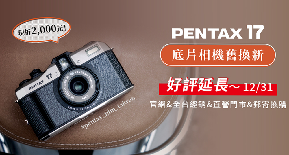 PENTAX 17 底片相機~台灣限定-TKO 親簽標準版~ 經典重現,傳承傳統工藝之美 懷舊捲片手感,讓每次拍攝成為樂趣 全新自動曝光系統,好照片垂手可得 縱向構圖,輕鬆手機分享玩創意 區域對焦與7種拍攝模式,創作輕鬆迅速 手動ISO與曝光補償,靈活掌控光影 提示燈智能提醒對焦與曝光,拍攝成功率更高 分享到: 前往購買 關於PENTAX 17 熱門產品 PENTAX WG-1000 NEW 工業級 防水相機 K-1II 單機身 GF-2 迷你閃光燈 NEW FLASH Q Q20III 無線閃光燈 Papilio II 6.5x21 近距離望遠鏡 NEW!超廣角 限量系列HD D FA 21mm F2.4 Limited DC WR THETA Z1 51GB 旗艦級 360VR 全景相機註冊禮!多功能小腳架 NEW!VM 6x21 WP 高機能望遠鏡-大全配 RICOH GRIII 標準版註冊禮!GR 3C配件包