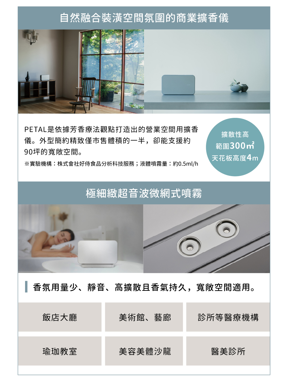 有效空間90坪X4米高 超靜音設計,舒緩效果提升 極細緻超音波微網式噴霧 日式簡約外型,百搭各種裝潢風格 適沙龍、SPA、醫美診所...等商業空間 →「PETAL 精油組」賣場 NT$46800