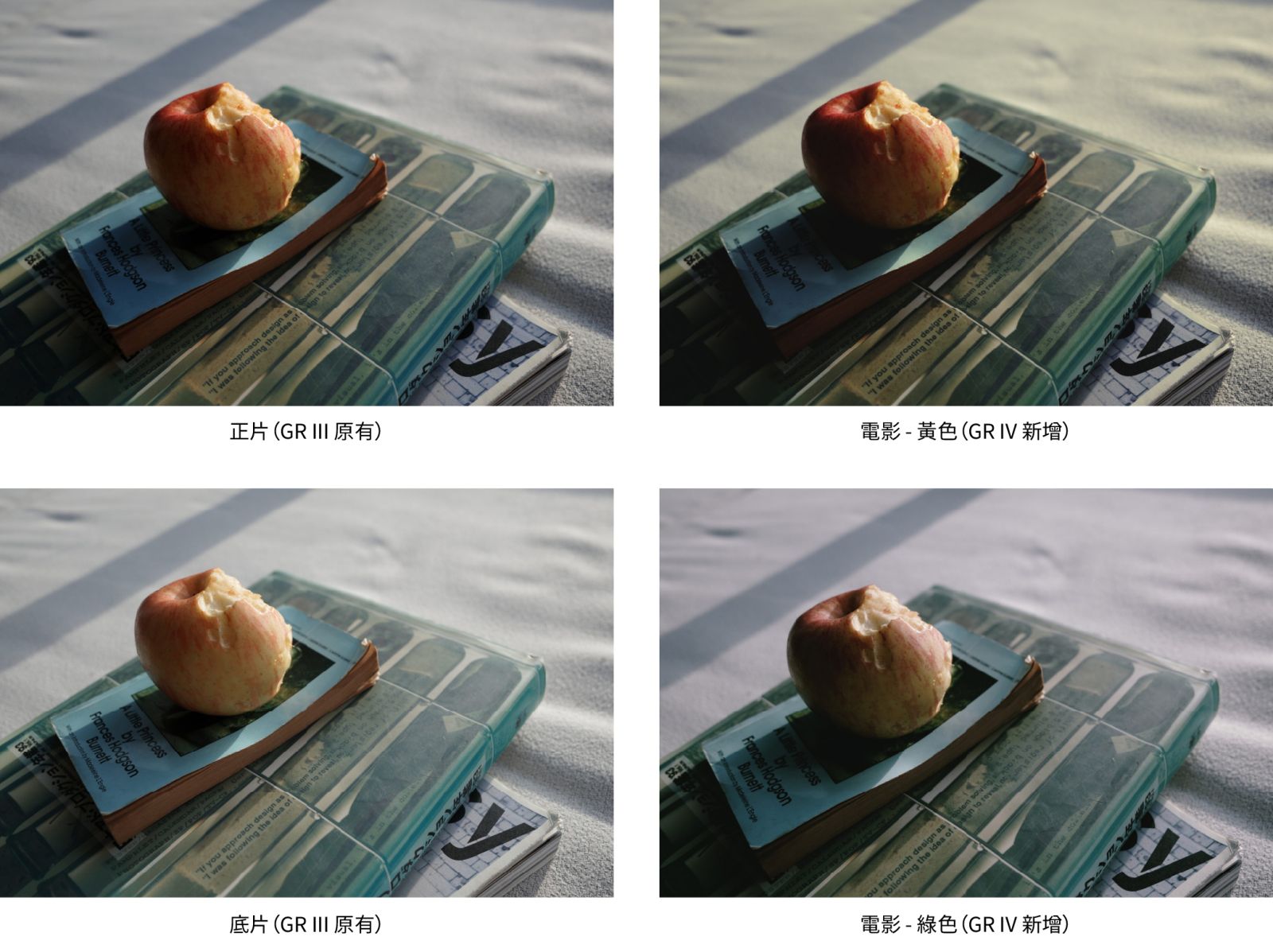 色彩一直是 GR 的靈魂之一。除了保留 GR III (GR3) 的「底片」「正片」這些經典模式之外,GR IV (GR4) 加入了全新的 「電影」濾鏡系列。